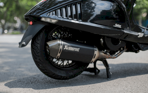Sự chăm chỉ đến từng chi tiết còn thể hiện trong việc thay thế ống xả nguyên mẫu bằng ống xả Akrapovic, tăng thêm sức mạnh cho chiếc Vespa và tạo ra âm thanh phấn khích khi điều khiển.